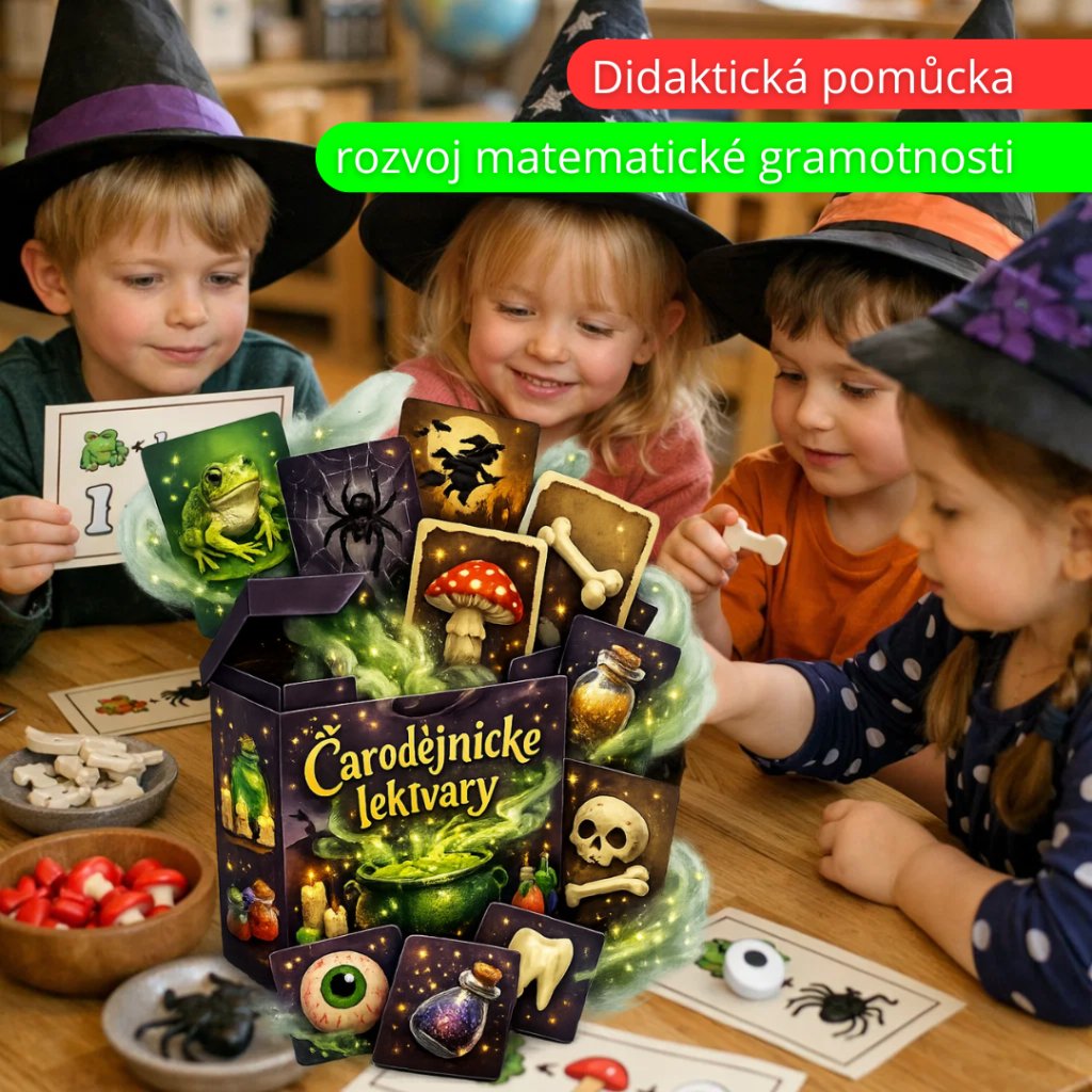 🧙♀️ Čarodějnická laboratoř – vaříme lektvary je hravá didaktická pomůcka, která děti promění v malé čaroděje a čarodějnice. Děti podle receptů připravují kouzelné lektvary a přidávají jednotlivé ingredience do čarodějnického kotlíku.