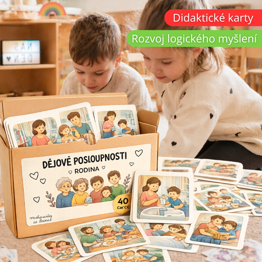 Didaktický soubor, který rozvíjí porozumění časové posloupnosti, vztahům v rodině a vývoji člověka od narození po stáří.