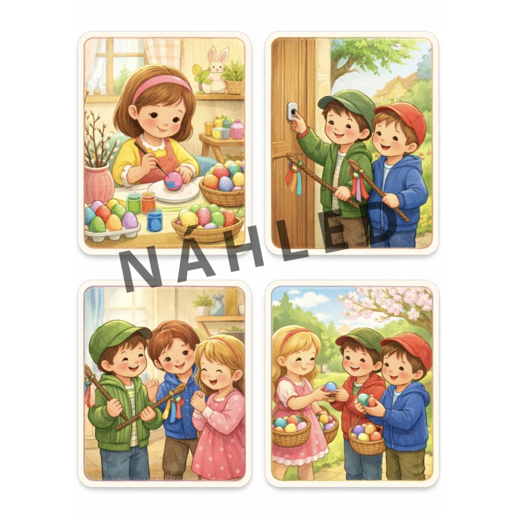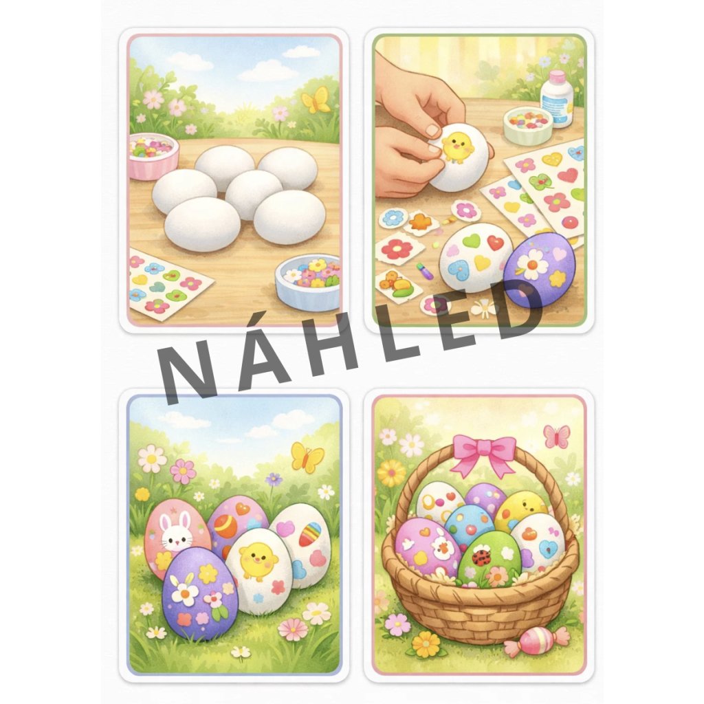 Soubor dějových posloupností s velikonoční tematikou pomáhá dětem pochopit děj, časovou posloupnost a souvislosti.