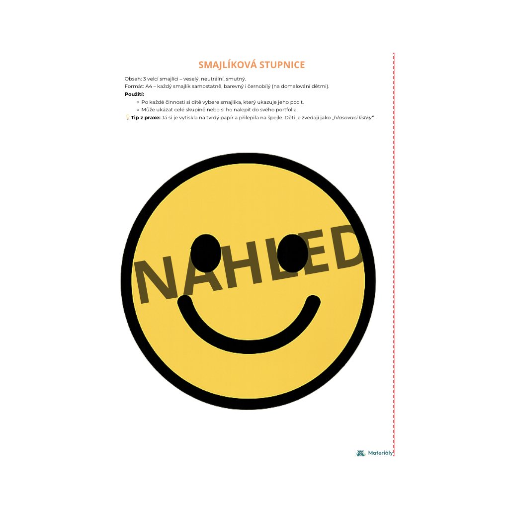✔️ připravené materiály k tisku: smajlíková stupnice, kostka sebehodnocení, kartičky, teploměr emocí, kolo pocitů aj.
