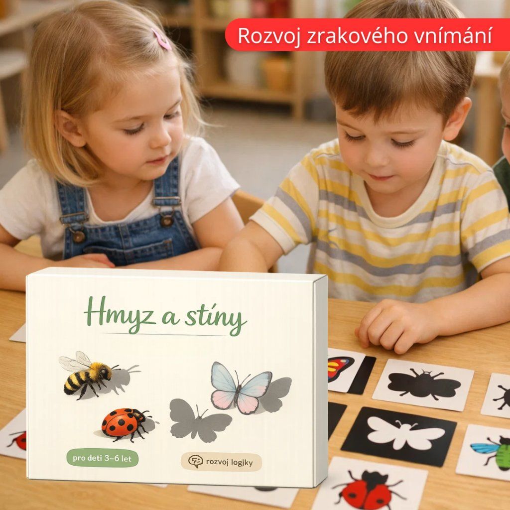 Děti v něm pracují s obrázky hmyzu a jejich černými siluetami (stíny), které přiřazují podle tvaru. Aktivita přirozeně rozvíjí zrakové vnímání, schopnost porovnávání a logické myšlení 🧠