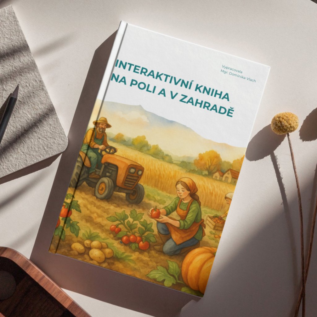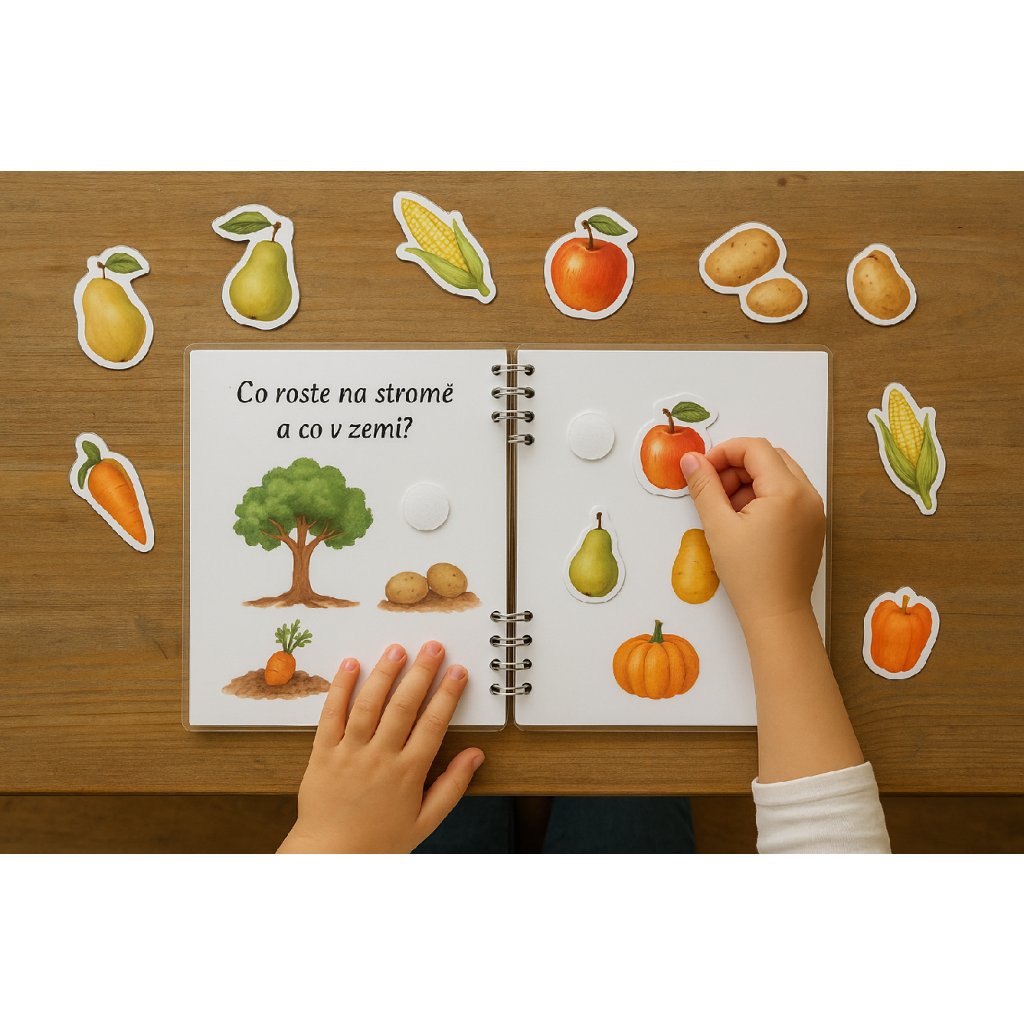 Interaktivní knížka Na poli a v zahradě dětem hravou formou ukáže, co se sklízí na podzim, co roste na stromě nebo v zemi a kdo žije na statku. Stačí vytisknout, zalaminovat a doplnit suchý zip – a děti si procvičí slovní zásobu, logiku i jemnou motoriku. 🌽🍎🥔