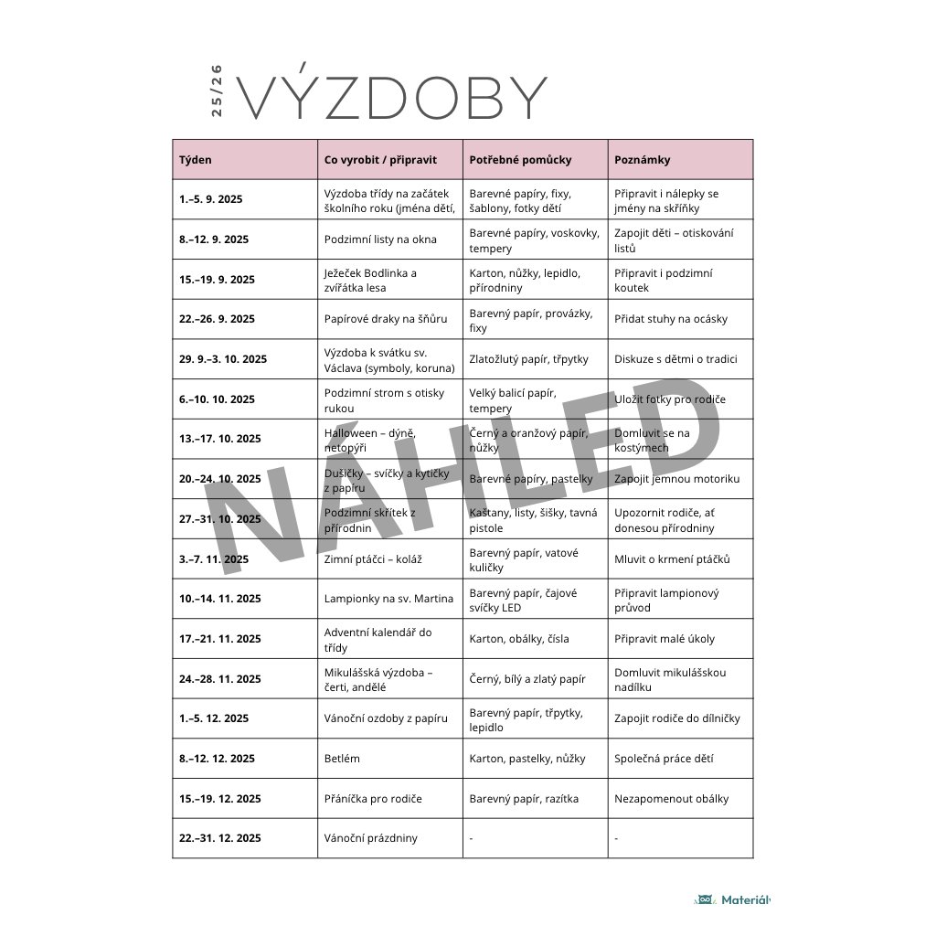 📅 Kalendář a plánovač paní učitelky 2025/2026 – 61 stran plných přehledů, tabulek a checklistů, které vám pomohou zvládnout celý školní rok v MŠ bez stresu. Od září do června budete mít vše na jednom místě – měsíční přehledy, denní rozvrhy podle RVP, prostor pro školní akce, spolupráci s kolegyněmi, konzultace s rodiči i plánování výzdoby. Krásný pastelový design, připravený k tisku.