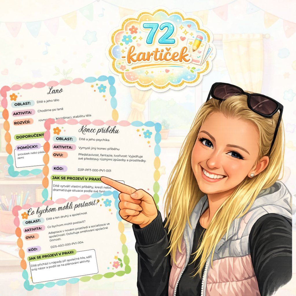 💡 Kartičky doporučujeme vytisknout na pevnější papír nebo zalaminovat. Můžeš si je uložit do krabičky a používat jako praktickou učitelskou pomůcku při plánování aktivit.
