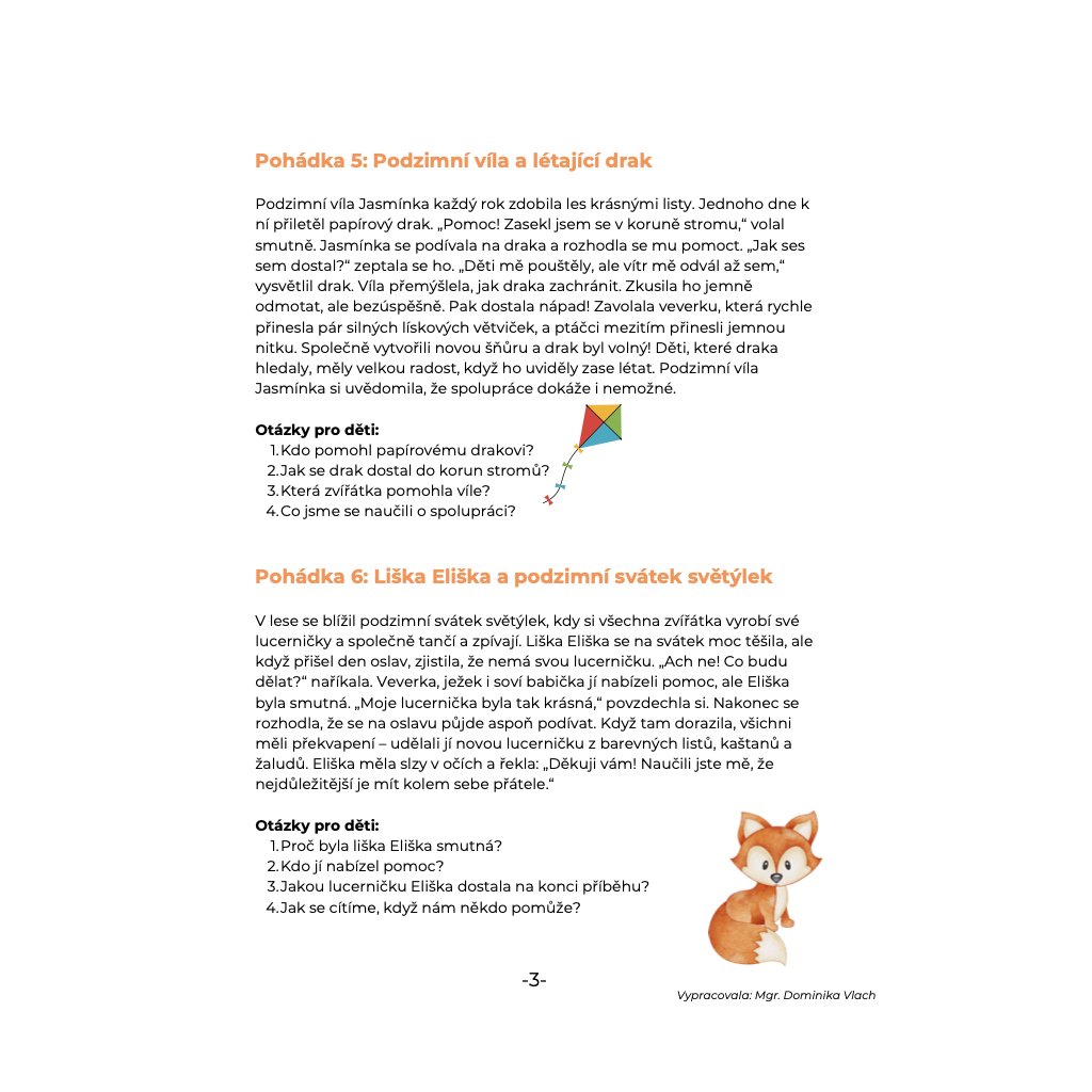 🍂 Pohádkové podzimní příběhy – balíček plný pohádek, aktivit a pracovních listů pro děti ve věku 3–6 let. Vše připraveno tak, aby děti nejen poslouchaly a vnímaly, ale také tvořily, hýbaly se a zapojily svou fantazii.