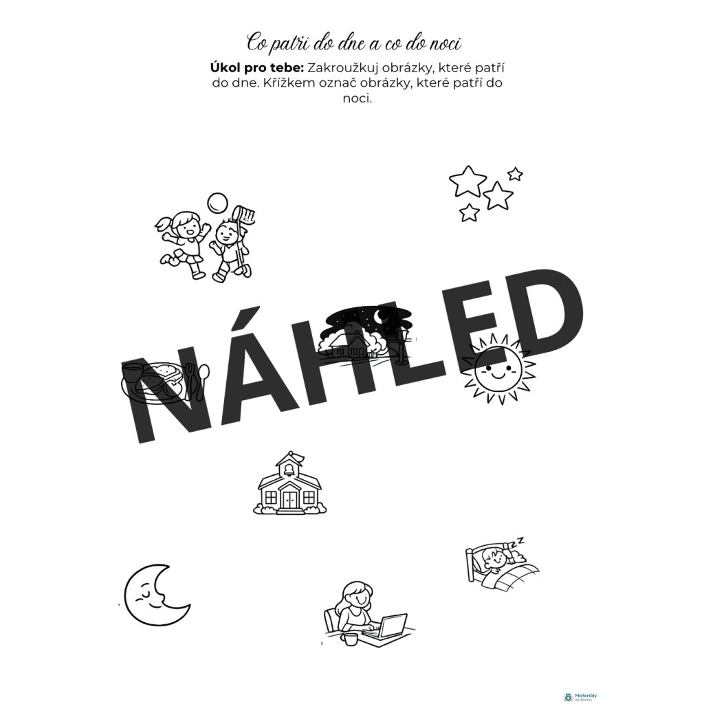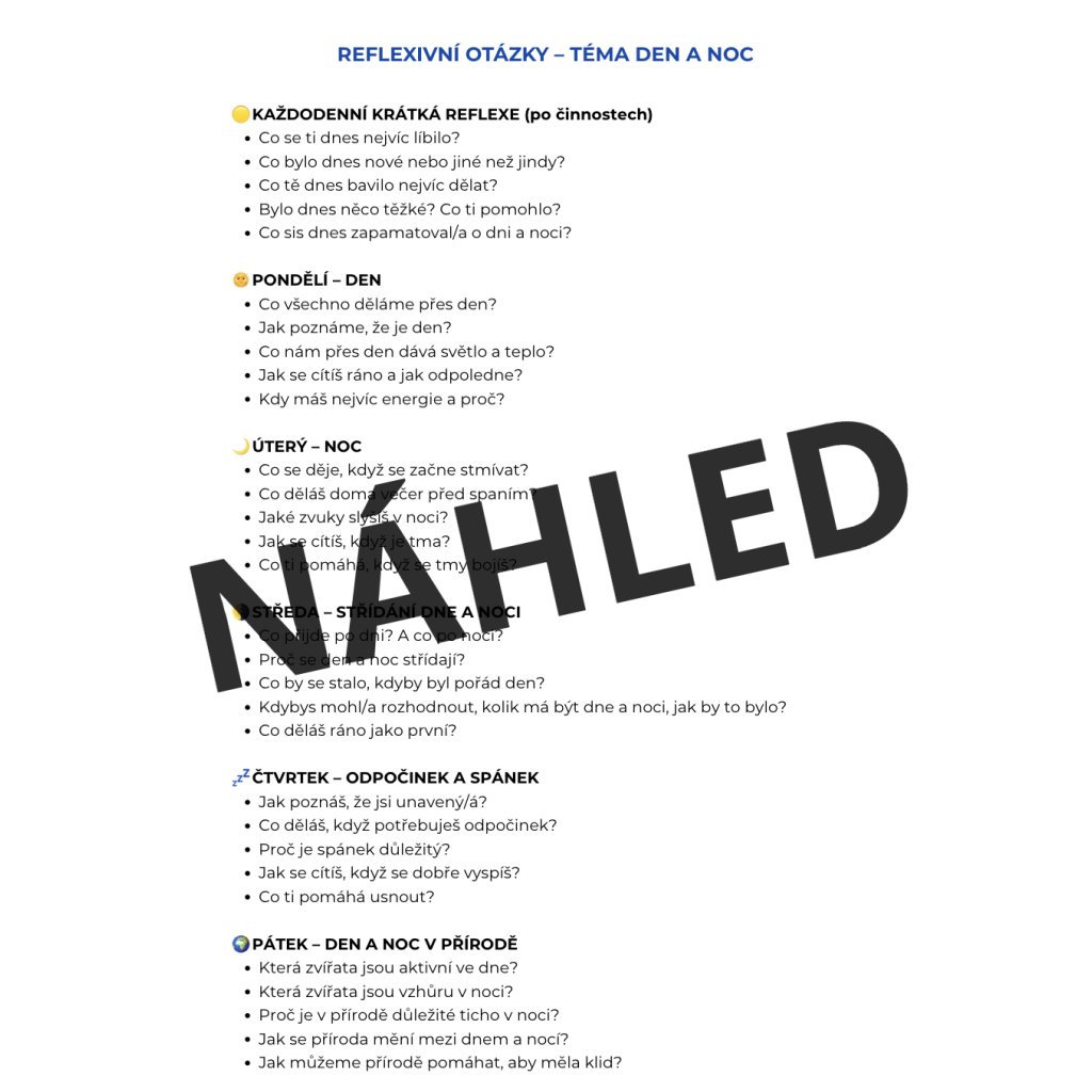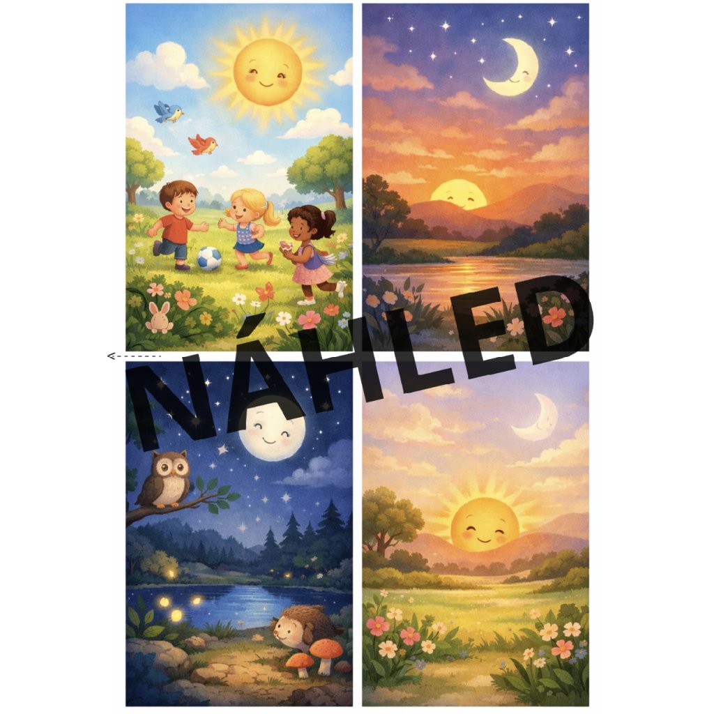 Tento tematický soubor propojuje pohádky 📖, plakáty 🃏, dějové posloupnosti 🔄, pracovní listy ✏️ i pohybové hry 🤸♀️, díky kterým děti pochopí přirozený rytmus dne hravou formou.