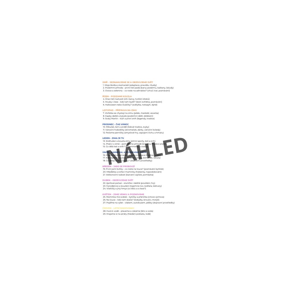 95 stran kompletně propracovaných aktivit od září do února. Pohybové a smyslové hry, výtvarné a hudební činnosti, grafomotorika, říkanky, pohádky i pracovní listy.