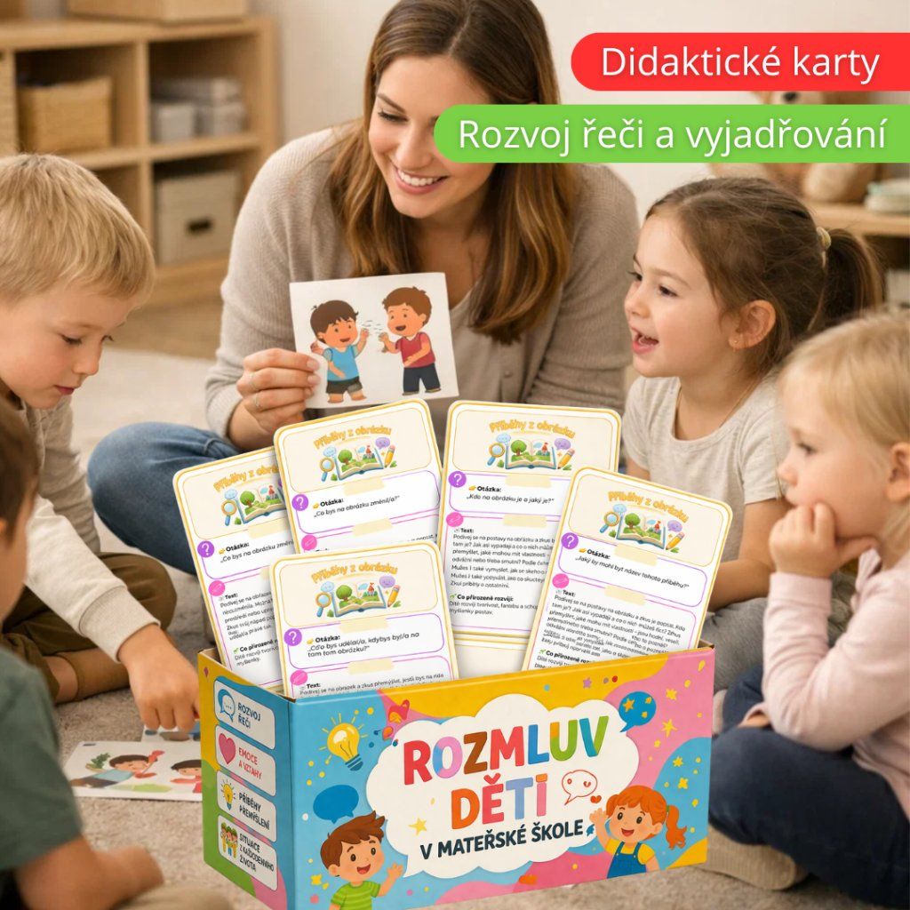 Soubor propojuje otázky + reálné situace + obrázky, díky kterým děti přirozeně mluví, přemýšlí a učí se chápat emoce i vztahy.