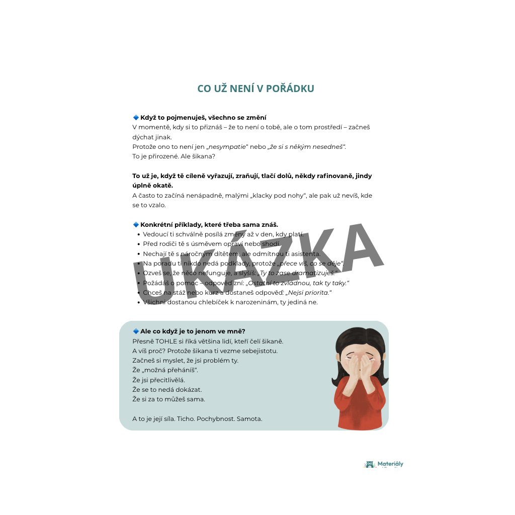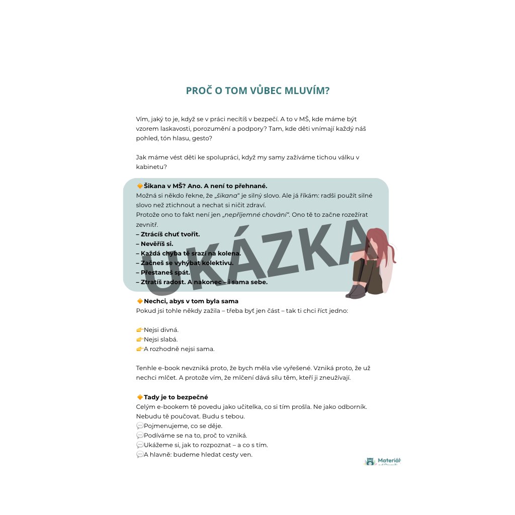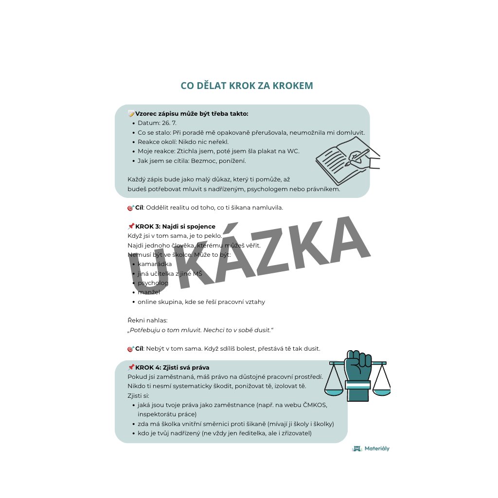 Autentický e-book napsaný srdcem. Příběh, opora, praktické taháky a věty, které ti pomůžou, když už nechceš mlčet. Pro každou paní učitelku, která si zaslouží cítit se v práci bezpečně.