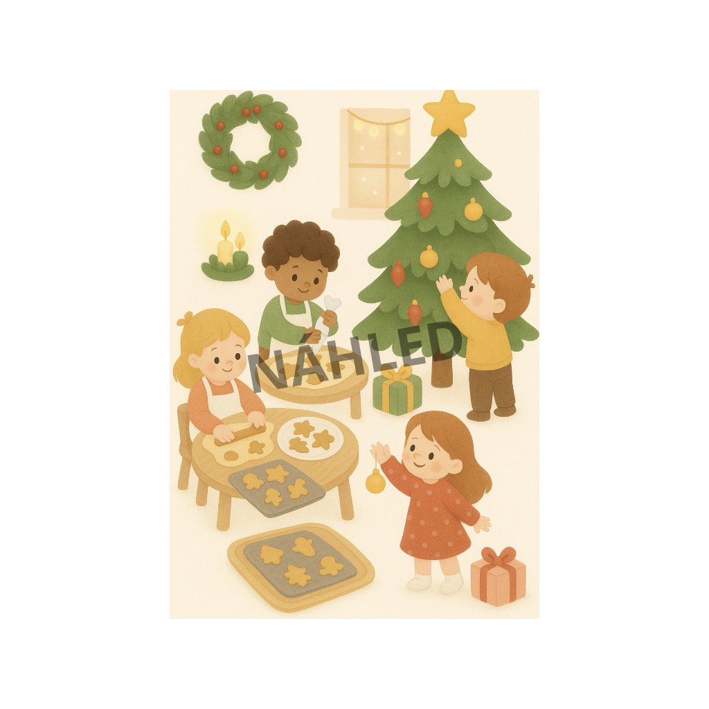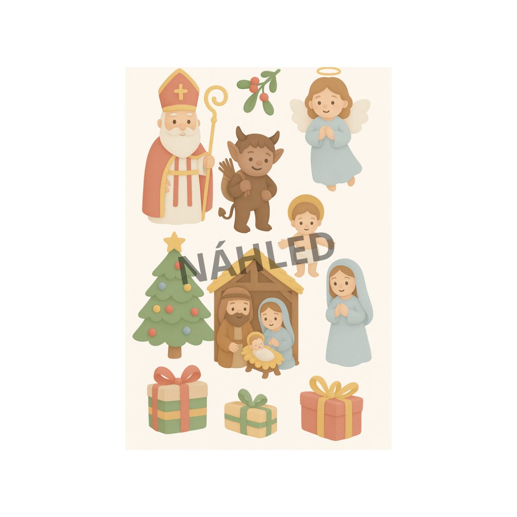 Sada 30 nádherných oboustranných plakátů ve velikosti A3 – vždy s verzí s pozadím i bez pozadí. Ideální pro výzdobu, pracovní koutky i tematické aktivity. Jemné pastelové ilustrace s českými vánočními motivy – děti, betlém, zdobení stromečku, pečení cukroví, Mikuláš, anděl, čert, kapr a rozbalování dárků.