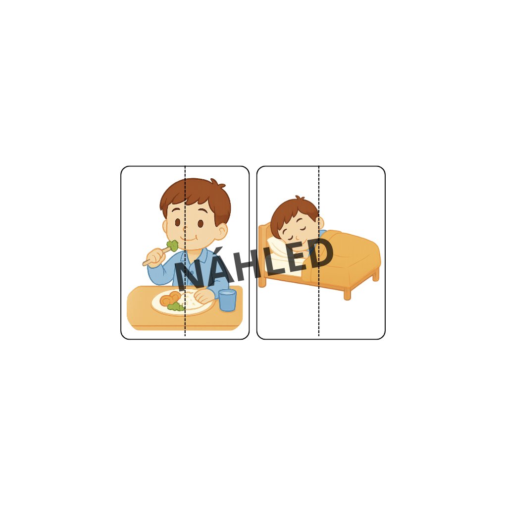 Ilustrované karty s českými popisky pomáhají dětem pochopit a osvojit si každodenní činnosti. Obsahují i půlené obrázky pro přiřazování a hru. 🧩 Ideální pro školku, dětské skupiny i domov.