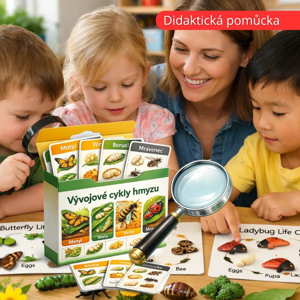 🦋 Vývojové cykly hmyzu – Naučný materiál pro děti, který jim hravou formou přibližuje proměny motýla, berušky, včely, mravence a mouchy. Barevné ilustrace ukazují všechny fáze vývoje od vajíčka až po dospělý hmyz! Skvělé pro školky i domácí vzdělávání. 🌿✨