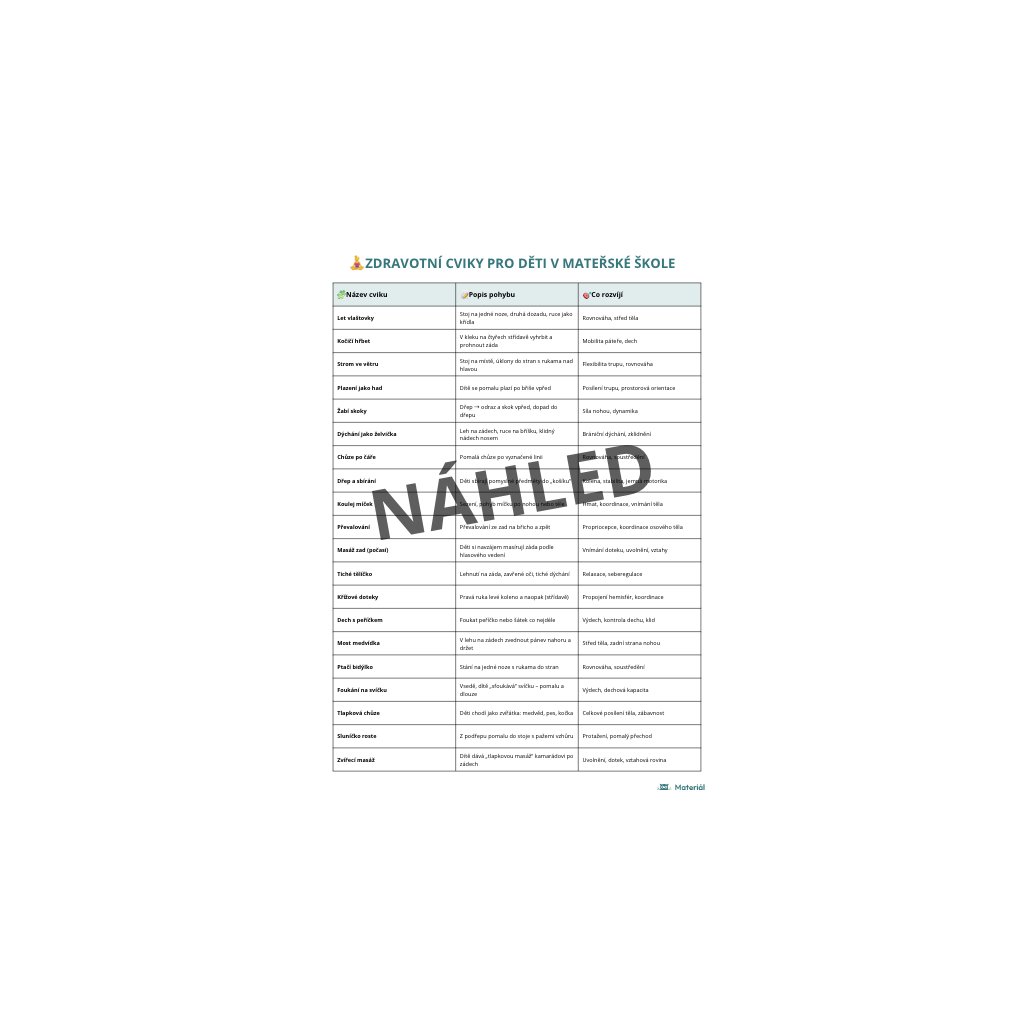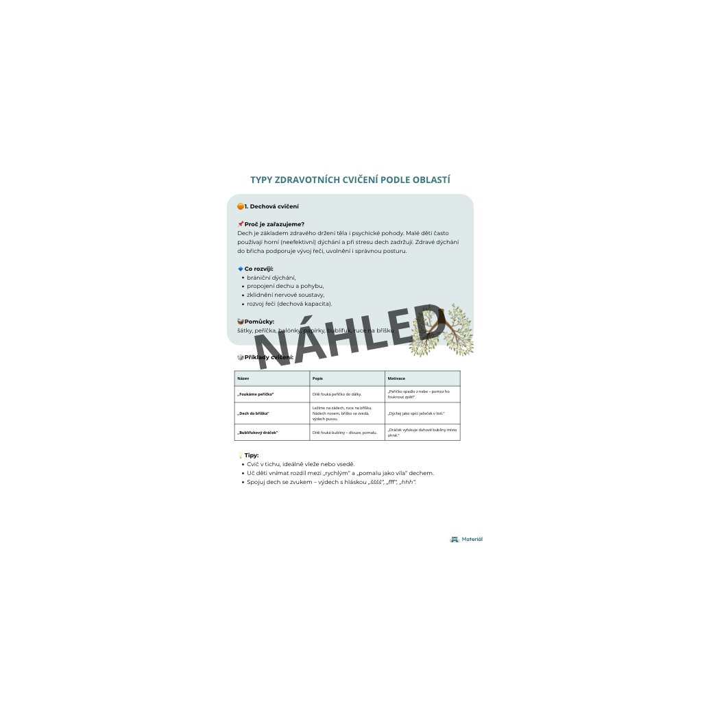 Tento soubor ti poskytne kompletní oporu pro zavedení zdravotního cvičení do každodenního režimu – ať už hledáš inspiraci na ranní rozcvičky, relaxaci po obědě nebo preventivní péči o zdraví dětí.